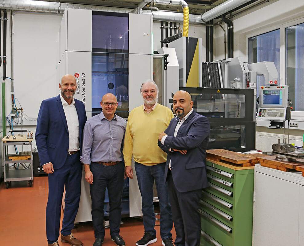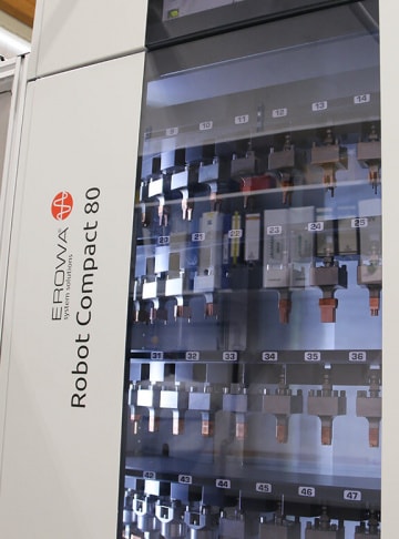 Für das Handling der palettierten Werkstücke und Elektroden kommt der EROWA Robot Compact 80 zum Einsatz. Auch hier liegen die Vorteile auf der Hand: Auf nur zwei Quadratmetern findet das Magazin mit über 80 Positionen inklusiv dem integriertem Greiferbahnhof und der ergonomischen Belade- und Rüststation Platz.
